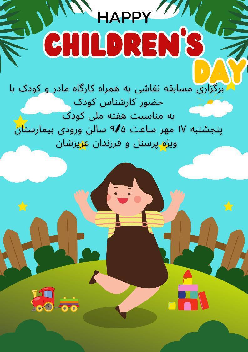 به گزارش روابط عمومی بیمارستان شهدای سلامت نی ریز،به مناسبت هفته ملی کودک بیمارستان شهدای سلامت اقدام به برگزاری مسابقه نقاشی ویژه فرزندان کارکنان بیمارستان نموده است .