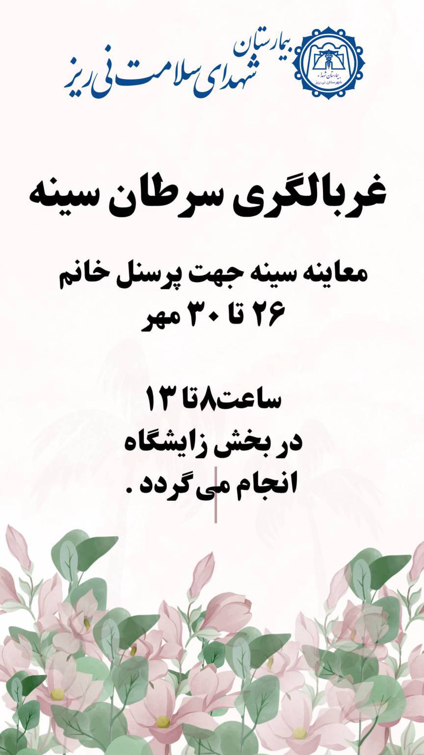 طرح غربالگری سرطان سینه ویژه کارکنان خانم شاغل در بیمارستان شهدای سلامت به مناسبت هفته ملی سلامت بانوان