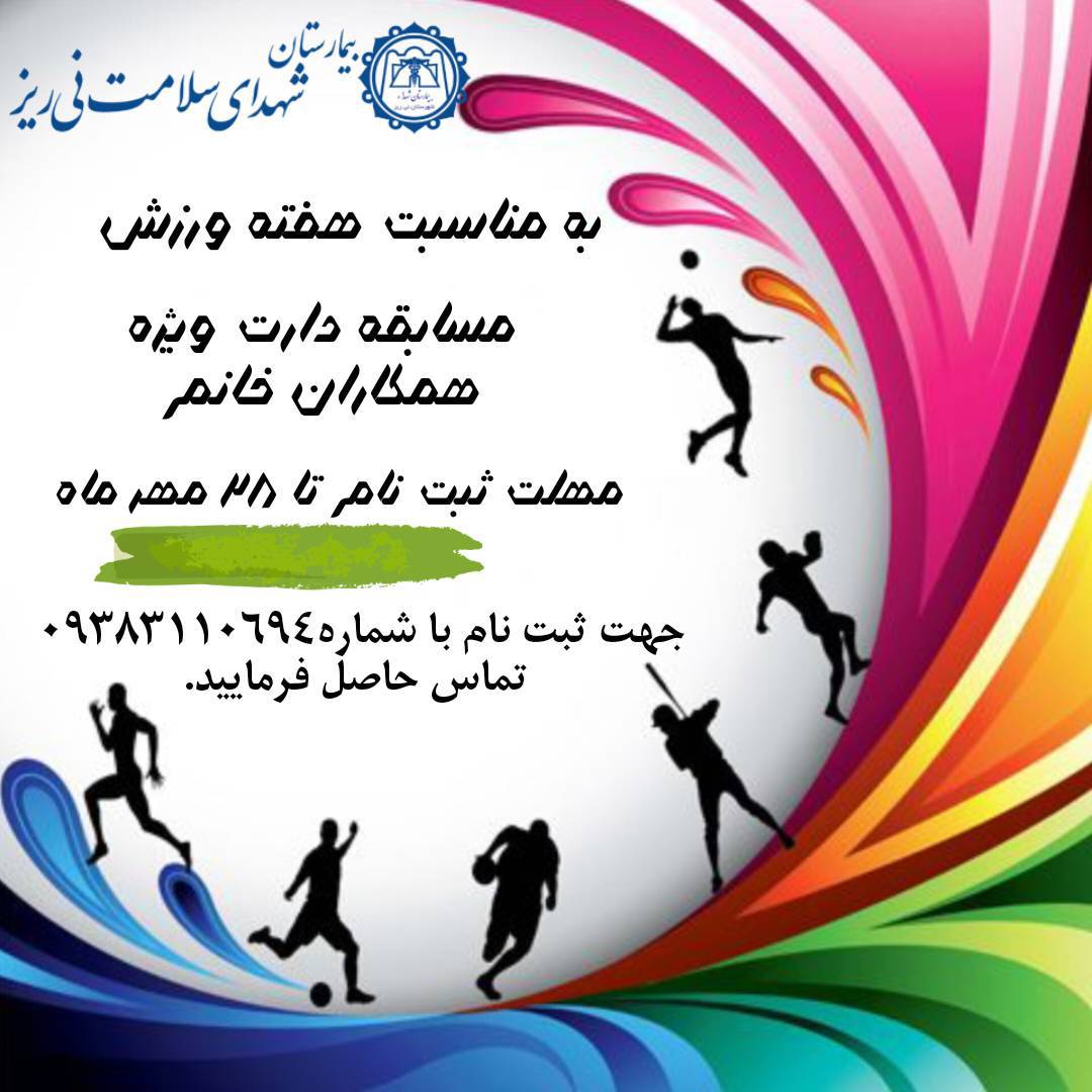 بیمارستان شهدای سلامت نی ریز، به مناسبت هفته تربیت بدنی مسابقه دارت ویژه کارکنان خانم برگزار می کند:
