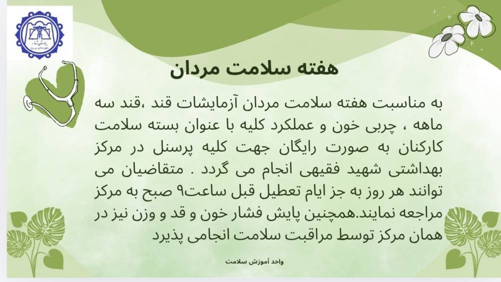 به مناسبت هفته سلامت مردان، واحد آموزش سلامت بیمارستان شهدای سلامت با همکاری شبکه بهداشت و درمان اقدام به پایش سلامت کارمندان زیر مجموعه خود نموده است .